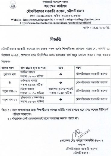 মৌলবীবাজার মহাবিদ্যালয় বাস যোগাযোগ সেবা