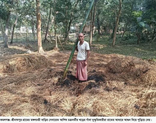 শ্রী শ্রী মঙ্গলচন্ডী বাড়ির সেবায়েত আশিষ চক্রবর্তী কান্নাজড়িত কন্ঠে জানান, আমি গরীব মানুষ। গত শনিবার রাতের আঁধারে দুষ্কুতিকারীরা আমার থড়ের গাঁদা পুড়িয়ে ক্ষতি করেছে। স্থানীয় লোকজনের প্রচেষ্টায় আগুন নিয়ন্ত্রণে আসে। কে বা কারা এই কাজ করেছে তা জানা নেই। কারো সাথে আমার শত্রুতাও নেই। আমি এ ঘটনার সুষ্ঠু বিচার চাই।