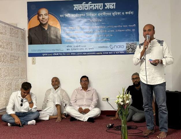 বন সিটি কর্পোরেশন নির্বাচনে প্রবাসীদের ভূমিকা ও কর্তব্য শীর্ষক মতবিনিময় সভায় বক্তারা এই আহ্বান জানান। গত ১৯ জুলাই বন নগরীরডুইসডর্ফে অবস্থিত ইন্টেগ্রেশন হাউজে অনুষ্ঠিত মতবিনিময় সভায় অন্যান্যের মধ্যে বক্তব্য রাখেন ইন্টেগ্রেশন হাউজের প্রতিষ্ঠাতা ও প্রধান নির্বাহীকর্মকর্তা এবং কোলন-বন বাংলাদেশ-জার্মান সমিতির সভাপতি বিশিষ্ট শিল্পপতি যুবরাজ তালুকদার, ইন্টেগ্রেশন হাউজের প্রধান উপদেষ্টা এবংকোলন-বন বাংলাদেশ-জার্মান সমিতির সহ-সভাপতি নুরুল ইসলাম, প্রবাস থেকে রেমিট্যান্স পাঠানোর বিশ্বস্ত প্রতিষ্ঠান না’লা বাংলাদেশ এর হেডঅফ গ্রোথ মাহমুদুল হাসান এবং বন সিটি কাউন্সিল এবং ইন্টেগ্রেশন কাউন্সিলের আসন্ন নির্বাচনে এসপিডি মনোনীত প্রার্থী ড. আব্দুল হাই।